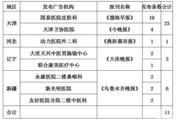 其中天津發布虛假違法中醫醫療廣告情況較為嚴重,國泰醫院皮膚科在《渤海早報》發布19條次,天津衛協醫院在《今晚報》發布4條次。河北省的動力醫院外二科在《燕趙都市報》發布1條次。遼寧省的大連天興中醫胃腸鏡中心和聯合康美醫療中心在《大連晚報》分別發布2條次、1條次。新疆維吾爾自治區的永康醫院二樓鼻喉科、新光明醫院、友好醫院分院二樓中醫科在《烏魯木齊晚報》各發布2條次。具體名單見下: